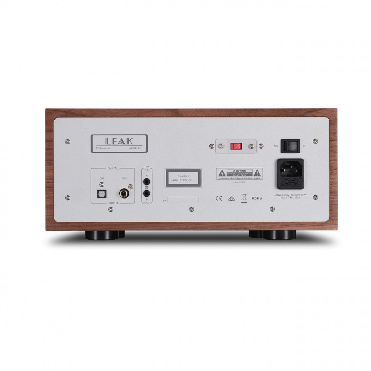 Leak CDT – CD-транспорт, совмещенный с USB-плеером для работы в составе HiFi-стереосистемы. Он оснащён оптическим приводом с щелевой загрузкой, а под ним, рядом с кнопками управления воспроизведением, есть разъем USB-A, который принимает флэш-накопители. Прямоугольные серебристые кнопки управления разместились на нижней черной кайме фронтальной панели. Чуть выше мы видим простой дисплей для отображения необходимого минимума информации о CD. В идеале он составляет гармоничную пару усилителю Stereo 130, поскольку он выполнен в той же дизайнерской гамме с боковыми декоративными деревянными панелями из натурального ореха.