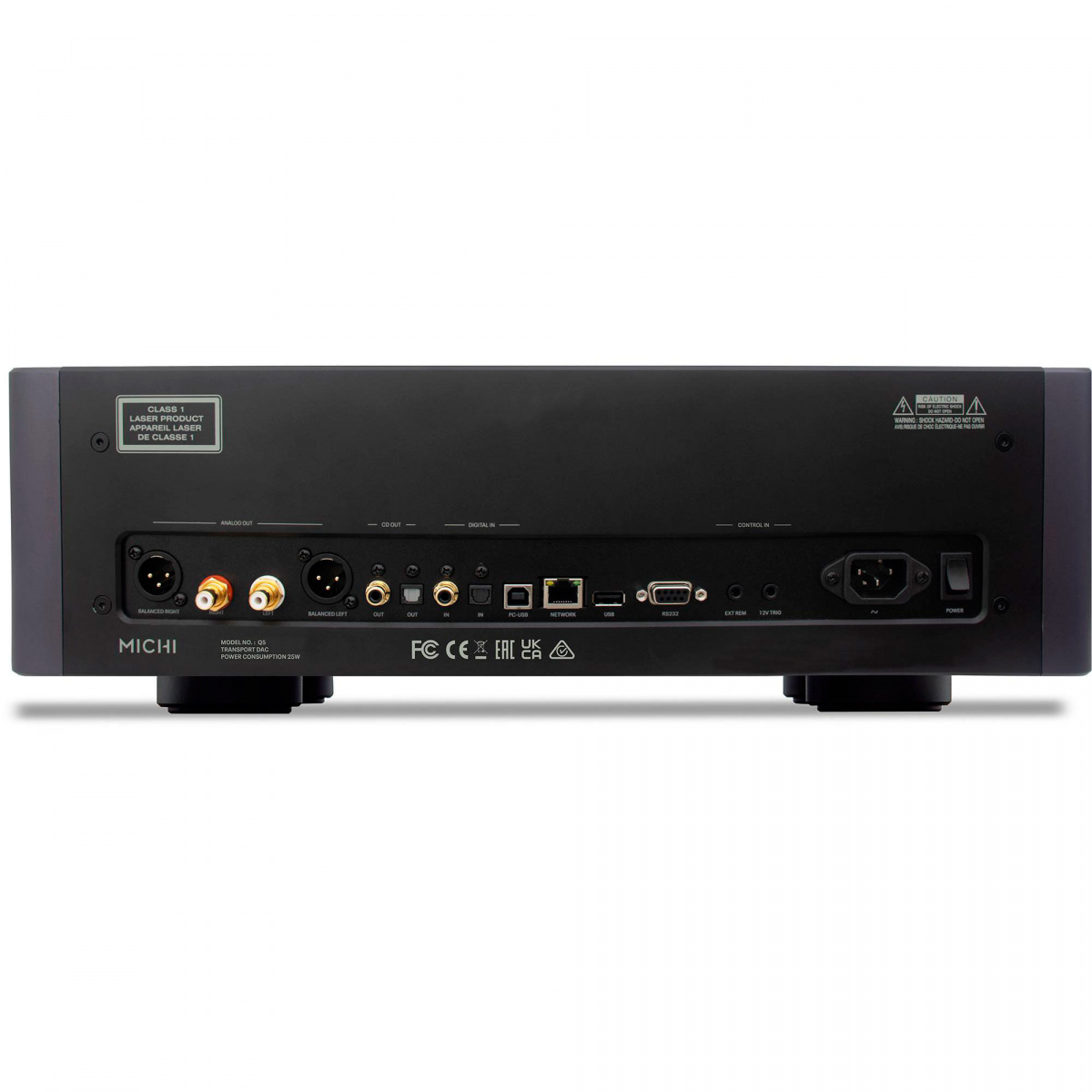 Дизайн Michi Q5 не только придает модели фирменный безупречный стиль, но и защищает чувствительные электронные компоненты от внешних помех. Уникальный верхний CD-механизм содержит прецизионную оптическую лазерную систему, встроенную в шасси из углеродного волокна и обработанного на ЧПУ алюминия. Это сочетание придает устройству высокую прочность и долговечность. CD-привод установлен на специальной плавающей пружинной платформе, что снижает вибрации, обеспечивая высокую стабильность для безупречно точного воспроизведения.