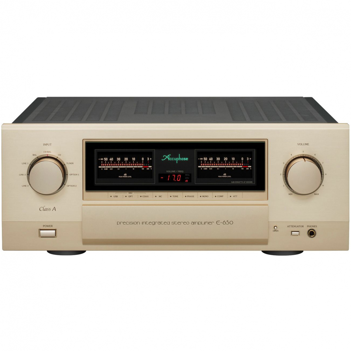 Красивые цифровые жидкокристаллические индикаторы завораживающе двигаются в такт музыке. В позолоченные высококачественные акустические разъёмы вы можете подключать кабели с разъёмами типа "лопатка". Accuphase E 650 это многофункциональный и широко оснащённый аппарат имеющий : Регулировку тембра и баланса, отключаемую тонкомпенсацию, включение и переключение двух пар акустики, высококачественный регулируемый выход на наушники, встраиваемый модуль с цифро-аналоговым преобразователем, встраиваемый модуль с ММ/МС фонокорректором, переключатель фазы сигнала на балансном входе (на задней панели усилителя).