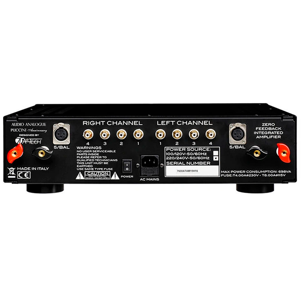 Также у Audio Analogue Puccini Anniversary все каскады усилителя расположены на независимых платах. Печатные платы имеют дорожки двойной толщины по сравнению со стандартными изделиями для увеличения электропроводности. Полностью двойное моно. Трансформатор от 700ВА, шесть пар силовых транзисторов On-Semiconductor (по три на канал). Внутренняя проводка с проводниками из чистой твердой меди 7N OCC, резисторы военного стандарта, полипропиленовые конденсаторы аудиокласса, выходные разъемы из позолоченной меди. Доступен в цвете натуральный алюминий или матовый черный.