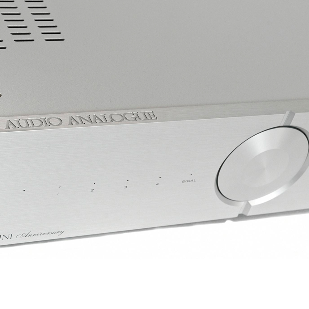 У Audio Analogue Puccini Anniversary тяжелый металлический корпус, передняя панель из матового алюминия толщиной 14 мм, пульт дистанционного управления, регулировка громкости на основе энкодера, управляющего четырьмя цифровыми высокоточными потенциометрами Analog Devices (по два на канал). Регулятор громкости имеет четыре кривые выбора в зависимости от чувствительности динамиков. Индикация уровня громкости и выбранного входа с помощью белых светодиодов с регулировкой яркости на двух уровнях или выключением. Входы с высококачественными позолоченными разъемами RCA с тефлоновой изоляцией, припаяны непосредственно к входной плате и активируются через сигнальное реле.