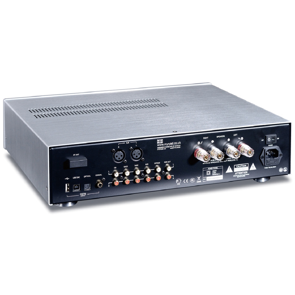 Аппарат оснащен широким набором входов. Аналоговая часть представлена балансным и четырьмя линейными небалансными подключениями. Кроме того, Myryad Z350 имеет встроенный ЦАП на микросхеме ESS ES9219C с оптическим, коаксиальным и двумя USB-входами (USB-A и USB-B). Максимальное значение параметров входных сигналов для последних может составлять до 32 бит / 768 кГц (PCM) и DSD512. В усилителе предусмотрен и беспроводной приемник Bluetooth версии 5.0 для удобного прослушивания музыки с мобильных устройств.