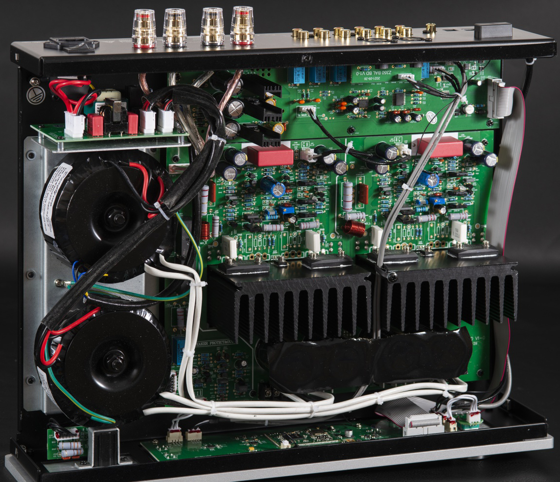 Оконечные усилители в модели построены по принципу двойного моно, с использованием раздельных тороидальных трансформаторов для питания каждого канала. Схема выполнена с использованием дискретных компонентов, которые проходят строгое тестирование на соответствие параметров требуемым допускам. Выходные каскады усилителей построены на мощных транзисторах Sаnken, способных отдать в нагрузку значительный ток. Myryad Z350 способен развить мощность до 200 Вт на канал при подключении 4-омной акустики, что гарантирует уверенную раскачу даже моделей с низкой чувствительностью. В усилителе есть и выход для подключения наушников.