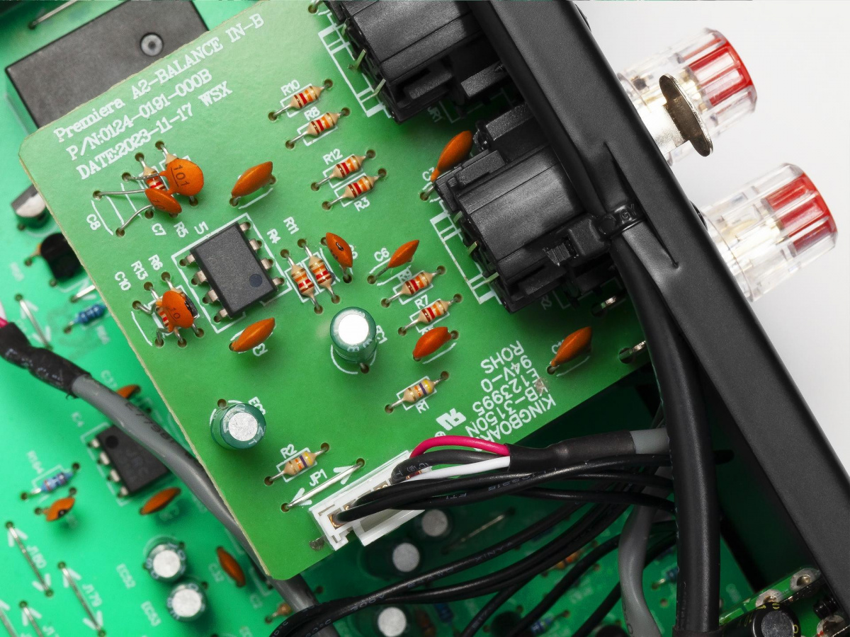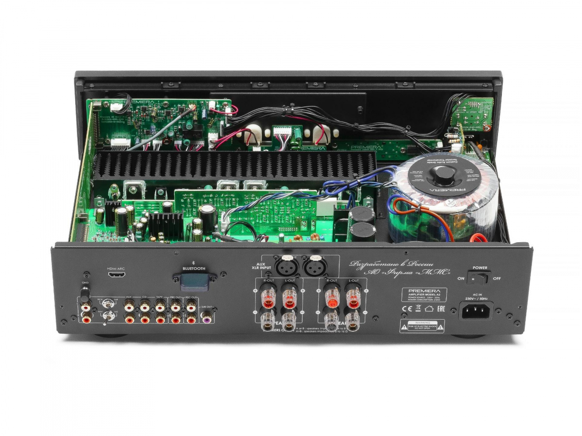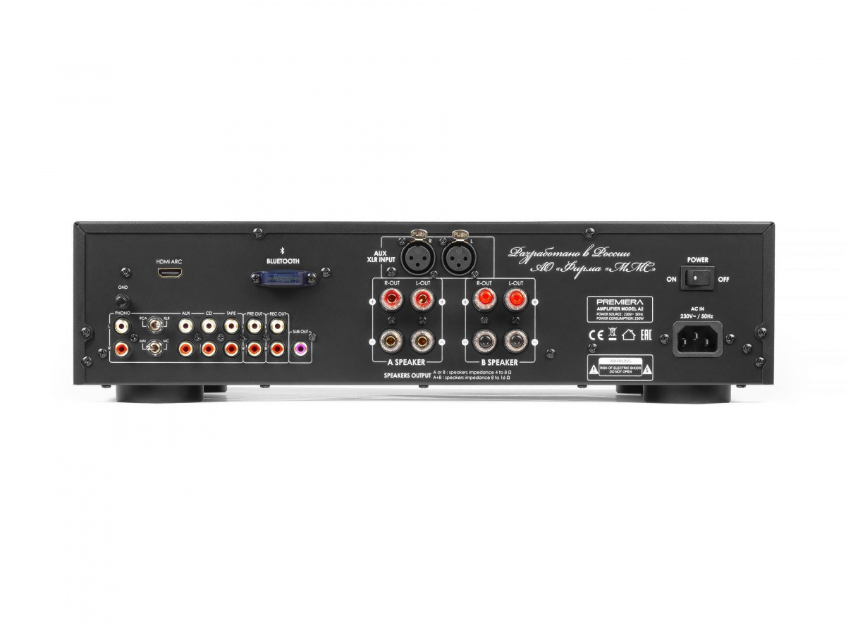 Возможных источников входного сигнала – семь, включая USB флешку. При этом один из линейных входов является балансным, что нечасто встречается даже в значительно более дорогих устройствах. Имеются и три аналоговых выхода – два стерео (регулируемый для внешнего усилителя) и один моно (для активного сабвуфера). Да, и к Premiera A2 можно подключить не одну, а две пары акустических систем! Вход HDMI ARC расширяет возможности усилителя, позволяя воспроизводить звуковую дорожку с любого современного телевизора, игровой или телевизионной приставки.