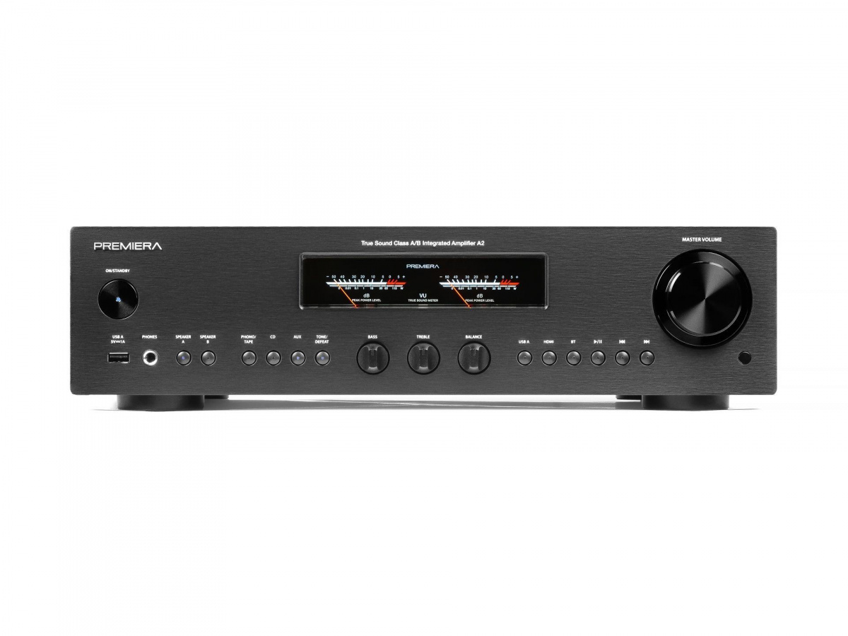 Premiera A2 - современный интегральный Hi-Fi стереоусилитель класса AB со встроенными MM/MC фонокорректором, Bluetooth и HDMI ARC, с номинальной выходной мощностью 55 Вт на канал.