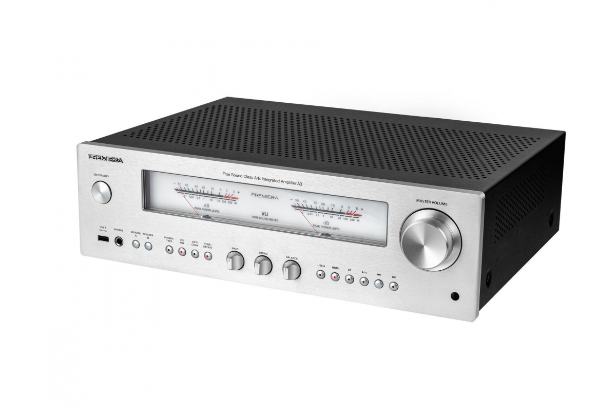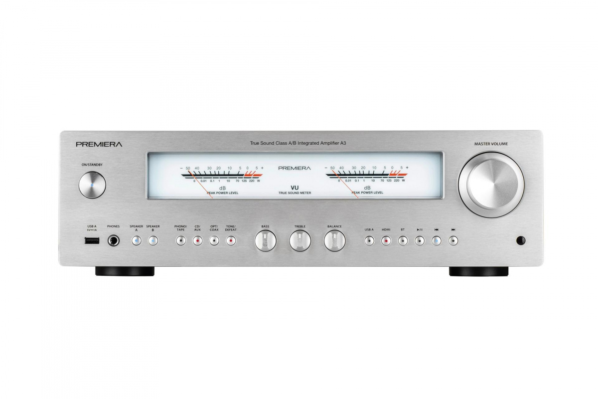 Premiera A3 - современный интегральный Hi-Fi стереоусилитель класса AB со встроенными MM/MC фонокорректором, ЦАП, Bluetooth, HDMI ARC, с номинальной выходной мощностью 110 Вт на канал.