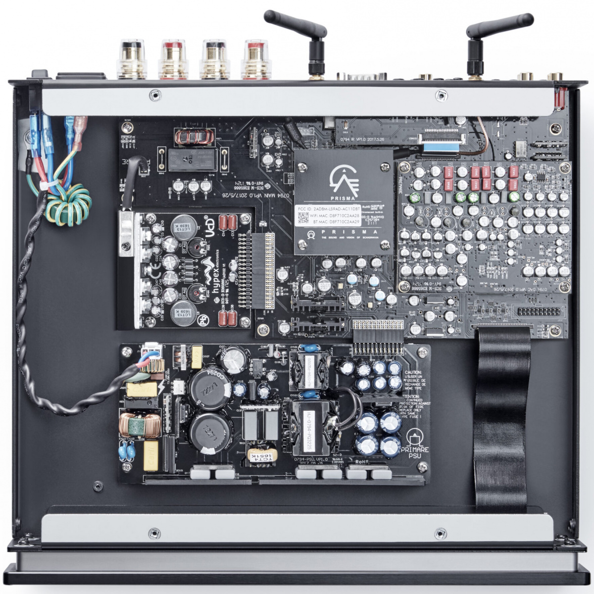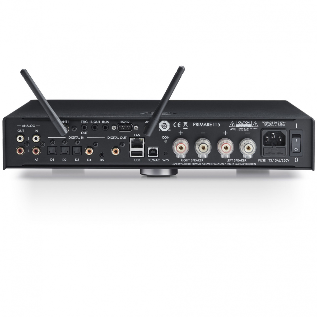 Primare I15 Prisma состоит из двух дискретных усилителей на сверхбыстрых блоках питания. Корпус Primare I15 Prisma выполнен из толстой стали, которая обеспечивает прочность и надежность, прекрасно экранирует устройство и эффективно поглощает вибрации внешних источников. Для уменьшения уровня искажений секция предусиления расположена в отдалении от секции усилителя мощности и питается от отдельного блока питания. Primare I15 Prisma оснащен одной парой несимметричных входных RCA разъемом, тремя оптическими входами, коаксиальным входом, USB тип A и B, линейным выходом . Кроме этого, возможности управления системой расширяются благодаря разъему RS232, инфракрасному входу/выходу и релейному выходу. Также в усилителе предусмотрены сетевые подключения при помощи Wi-Fi и Bluetooth технологий. Все сигнальные тракты сделаны короткими, насколько это возможно. Вся обработка сигнала (выбор источника, регулировка громкости и баланса) выполняется исключительно в аналоговом формате. Для регулировки громкости и баланса используется один аттенюатор LM1972. Выбор входов осуществляется при помощи высокоэффективных сигнальных реле.