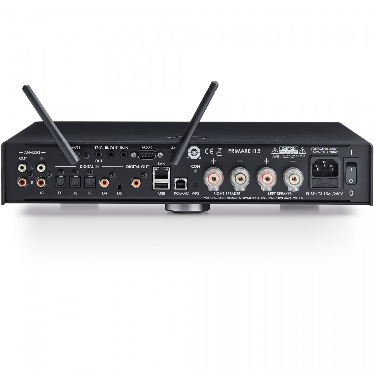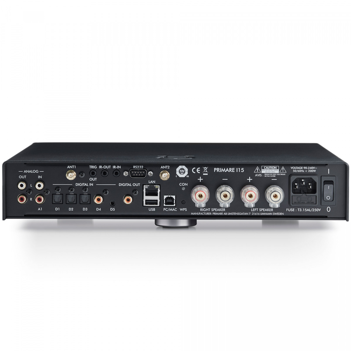 Primare I15 Prisma состоит из двух дискретных усилителей на сверхбыстрых блоках питания. Корпус Primare I15 Prisma выполнен из толстой стали, которая обеспечивает прочность и надежность, прекрасно экранирует устройство и эффективно поглощает вибрации внешних источников. Для уменьшения уровня искажений секция предусиления расположена в отдалении от секции усилителя мощности и питается от отдельного блока питания. Primare I15 Prisma оснащен одной парой несимметричных входных RCA разъемом, тремя оптическими входами, коаксиальным входом, USB тип A и B, линейным выходом . Кроме этого, возможности управления системой расширяются благодаря разъему RS232, инфракрасному входу/выходу и релейному выходу. Также в усилителе предусмотрены сетевые подключения при помощи Wi-Fi и Bluetooth технологий. Все сигнальные тракты сделаны короткими, насколько это возможно. Вся обработка сигнала (выбор источника, регулировка громкости и баланса) выполняется исключительно в аналоговом формате. Для регулировки громкости и баланса используется один аттенюатор LM1972. Выбор входов осуществляется при помощи высокоэффективных сигнальных реле.