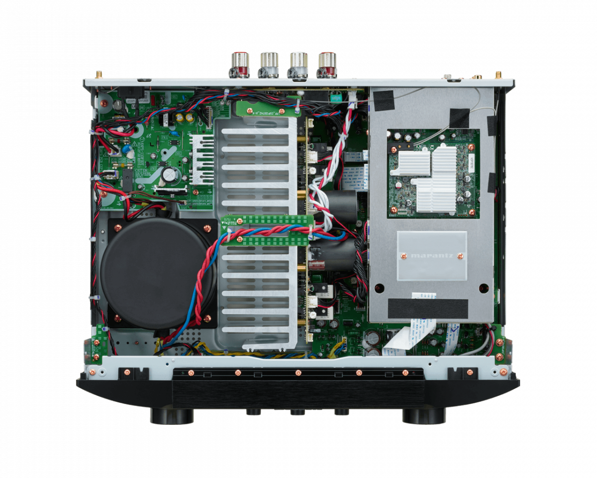 Фронтальную панель усилителя украшает трехстрочный OLED-дисплей. Поддерживается Apple AirPlay 2, двухдиапазонный Wi-Fi и Bluetooth. Доступ к аудиобиблиотекам, хранящимся на PC, Mac или NAS-серверах, осуществляется через WLAN или с помощью LAN-порта. По локальной сети и при использовании встроенного в тыльную панель корпуса USB-порта поддерживается воспроизведение форматов ALAC, FLAC, WAV до 24 бит/192 кГц и DSD до 5,6 МГц. На борту имеется MM-фонокорректор, входная секция которого использует полевые FET-транзисторы. В коммутации следует выделить отключаемый экранированный блок цифровых входов. Существует возможность подключения активного сабвуфера, а для подсоединения акустических систем задействованы две пары фирменных винтовых клемм Marantz SPKT-1+.