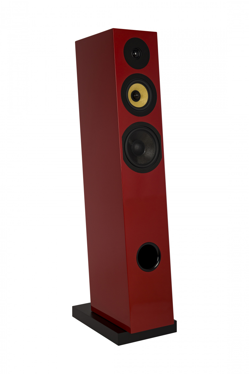 Прежде всего, это жёсткий корпус из толстых листов MDF, усиленный внутренними стяжками. В основании – массивная плита с резьбовыми втулками для шипов. За счёт небольшого наклона решаются две важные задачи: снижается вероятность возникновения стоячих волн и обеспечивается временное согласование всех трёх полос. При такой компоновке самый медленный, басовый диффузор, оказывается ближе к слушателю, а лёгкий купол твитера – дальше, поэтому фронты воспроизводимого ими сигнала приходят одновременно.
