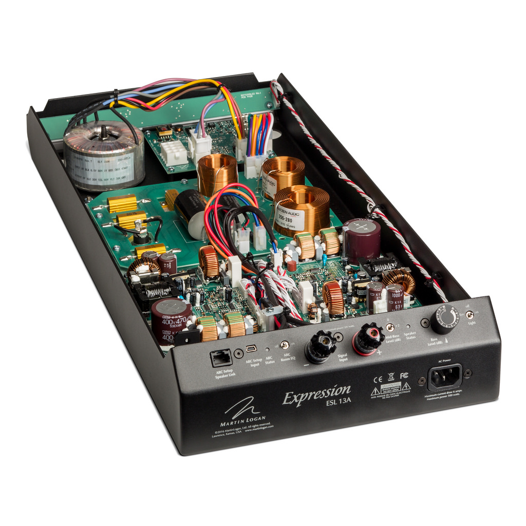 Гибридная акустика MartinLogan Expression™ ESL 13A «наследовала» от мощных Renaissance ESL 15A технологию коррекции звука Anthem Room Correction (ARC), ультражесткую конструкцию (ultra-rigid AirFrame) мембраны из экструдированного алюминиевого сплава аэрокосмической промышленности, имеет два независимых низкочастотных 10-ти дюймовых (25.4 см) динамика с алюминиевым диффузором и предельно низкими искажениями, работающих от 300-ваттных усилителей класса D и корректируемых по громкости технологией PoweredForce Forward под контролем 24-Bit Vojtko™ DSP Engine с ARC ™ (Anthem Room Correction), а также дипольный 13x44-дюймовый электростатический преобразователь с излучающей площадью 572 квадратных дюймов (дипольный электростатический преобразователь Impression™ ESL 11A - 11x44-дюймовый с излучающей площадью 484 квадратных дюймов, низкочастотники Impression™ ESL 11A - два 8-дюймовых вуфера). При весе в 103 фунта (46,8 кг) и размерах 61.5"× 13.4" × 27.5" (156.1cm × 33.9cm × 69.9cm) гибридные акустические системы MartinLogan Expression™ ESL 13A отнюдь не выглядят массивными, но впечатляюще эффектными, как визуально, так и по создаваемому звуковому давлению (до 600 Вт на канал практически без искажения частот в полосе 24–23,000 Hz ±3dB). Традиционно для гибридных акустических систем бренда акустика Expression™ ESL 13A трехполосная, а ФВЧ- и ФНЧ-кроссоверы с частотой 300Hz «обрезают» для каждого излучателя (группы) свои полосы частот. В акустику интенгрирован новый мощный Dual 300-Watt Class-D усилитель с 24-Bit Vojtko™ Digital Signal Processing (DSP), а собранный вручную с использованием только лучших полипропиленовых конденсаторов и катушек с воздушным сердечником, кроссовер использует запатентованную Vojtko топологию для нивелирования искажений и «бесшовной» интеграции излучателей driver/ESL. Для гармоничной интеграции акустических систем в интерьеры помещений MartinLogan планирует поставлять Expression™ ESL 13A с отделкой различных цветов и фактур.