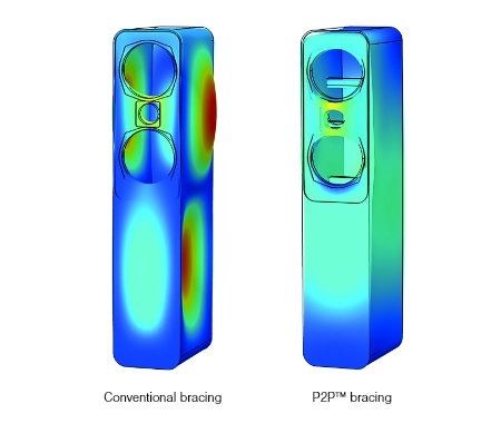 Профиль C3 Continuous Curved Cone в Q Acoustics Q5040 (QA5042), являющийся настоящим достижением в области элементов конструкции средне- и низкочастотных динамиков, является также результатом обширных исследований и экспертных разработок, призванных объединить преимущества басов, присущих традиционному прямому коническому диффузору, с контролем высоких и средних частот. расширяющегося конуса. Преимущества создания единого плавного непрерывного профиля кривой очевидны. Его превосходная дисперсия, наряду с хорошо контролируемой частотной характеристикой и пониженным уровнем гармонических искажений, обеспечивает более плавную интеграцию с твитером. Динамика глубоких басов также превосходна, благодаря этому, а также более плотному, затухающему низкочастотному звуку, обеспечивающему большую гибкость при размещении динамиков вблизи стен комнаты для прослушивания. Распорка Q Acoustics P2P (точка-точка), используемая во всей серии 5000, поддерживает части корпуса, которые необходимо укрепить, делая новые корпуса исключительно жесткими, улучшая фокусировку стереоизображения и придавая звуковой сцене большую точность, чем когда-либо прежде. Технология HPE (выравниватель давления Гельмгольца), разработанная для преобразования давления в скорость и уменьшения общего градиента давления внутри корпуса динамика, была применена в напольных динамиках 5050 только для уменьшения резонанса корпуса. Эта технология идеально подходит для более высоких громкоговорителей, которые имеют тенденцию резонировать на одной предпочтительной частоте.
