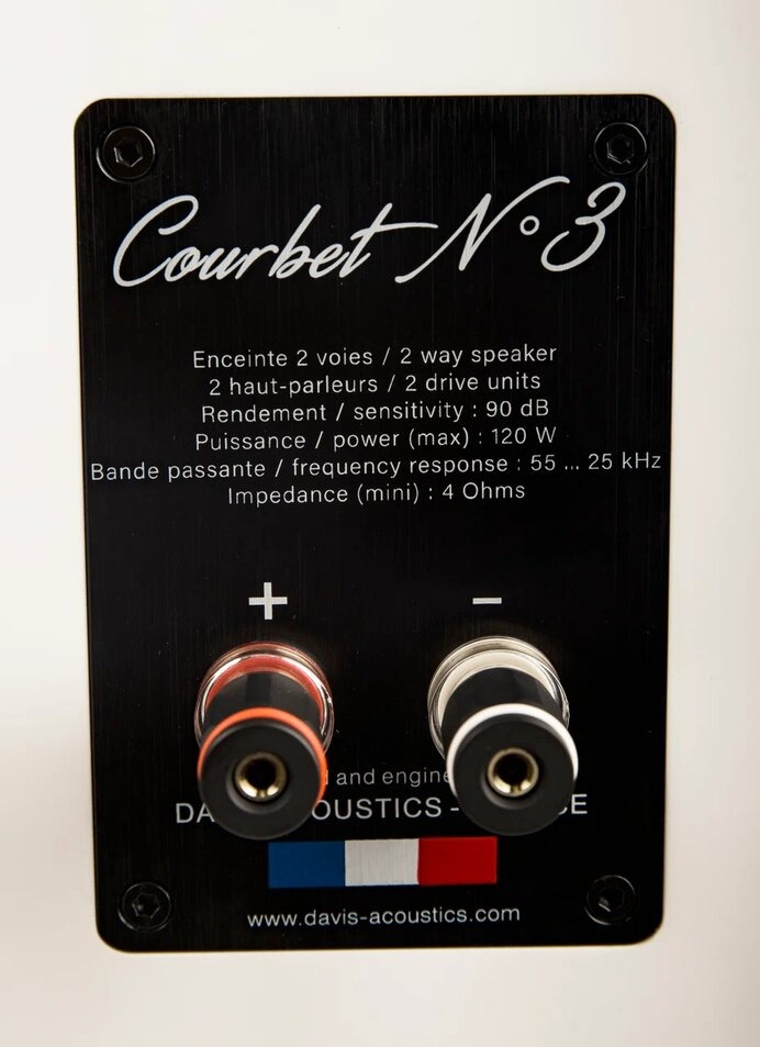 Среднечастотный динамик в Davis Acoustics Courbet №3, размер которого составляет 13 см, выполнен по традиции из кевлара. Это универсальный материал, который настолько прочен, что используется для бронежилетов, но при этом очень легкий. Применение динамика такого небольшого размера позволило сузить переднюю панель полочников до 17,5 см, что благоприятно сказалось как на дизайне, так и с точки зрения звука - узкая передняя панель минимизирует ранние отражения. Корпуса АС выполнены из толстого МДФ с распорками внутри. Лицевая панель немного наклонена таким образом, чтобы и высокие и низкие частоты до слушателя доходили в одно время.