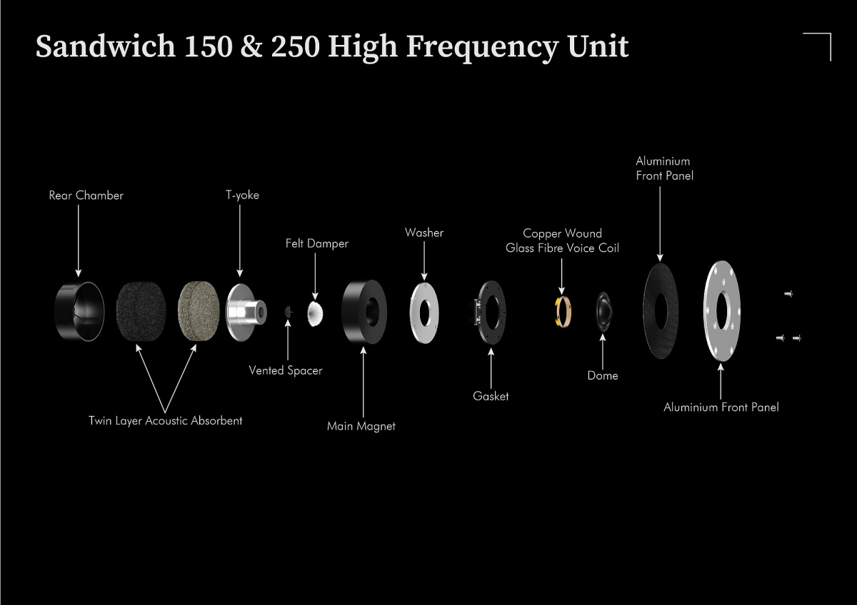 Для Leak Sandwich разработан высокочастотный динамик, включающий заднюю камеру, демпфированную для поглощения выходного сигнала из задней части купола. Изолированный отсек для ВЧ-блока предотвращает влияние на низкие частоты. Жесткая, длинная звуковая катушка, мощные магниты и податливые подвесы обеспечивают линейное движение специально разработанного ВЧ-блока.