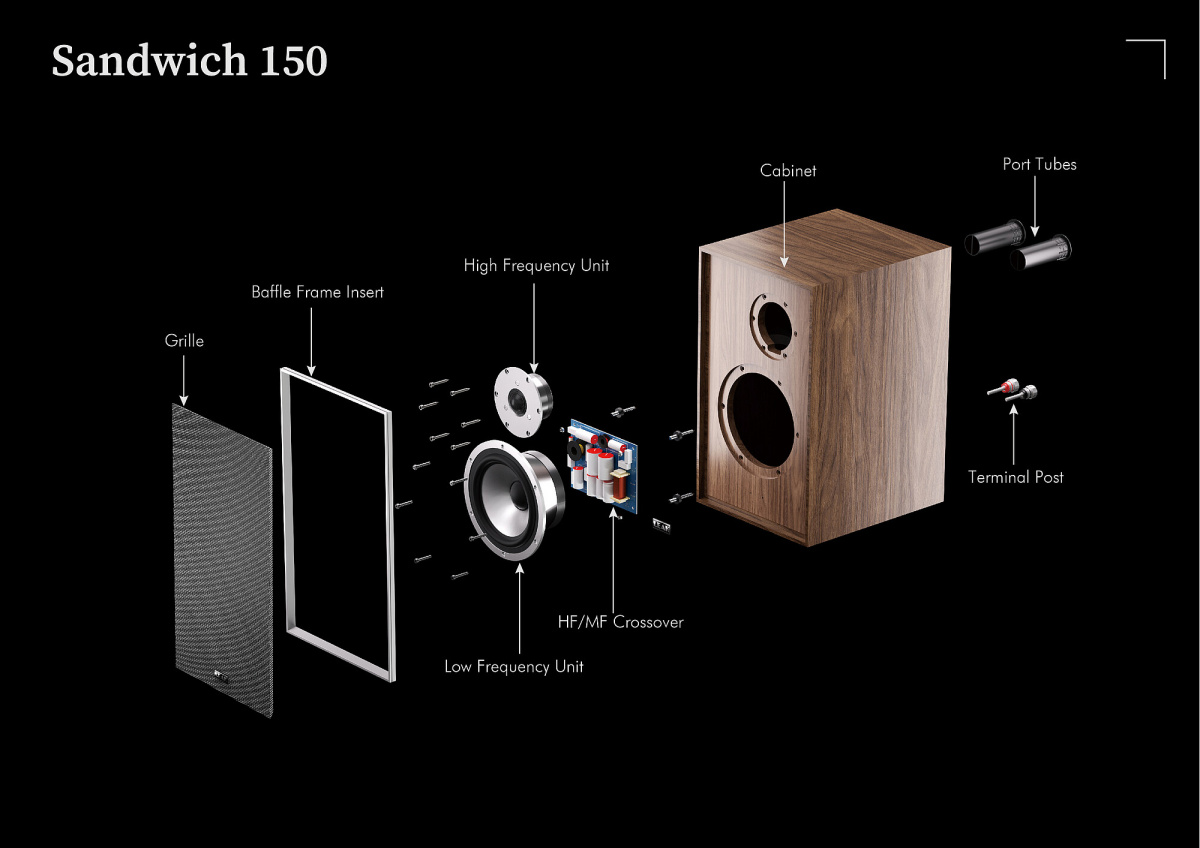Новый корпус Leak Sandwich создан на основе 60-летнего опыта производителя. Конструкция состоит из МДФ и композитных плит, уложенных слоями для обеспечения оптимальной прочности. Специально разработанный демпфирующий материал уменьшает нежелательные резонансы корпуса и расширяет басовую характеристику вниз за счет преобразования изменений внутреннего давления воздуха из адиабатического в изотермическое. LEAK Sandwich 150 оснащен двойными басовыми портами из ABS с точной расширяющейся конструкцией. Корпус обеспечивает эффективное выравнивание давления воздуха. Специально разработанная конструкция «сэндвич» и специальные распорки от фронтальной к задней панели обеспечивают глубокие чистые басы. Как литая под давлением рама, так и отверстие перегородки имеют такие форму и расположение, что обеспечивают ровный отклик за счет устранения эффектов дифракции и подавления стоячих волн. Отделка выполнена вручную из изысканного шпона натурального дерева.