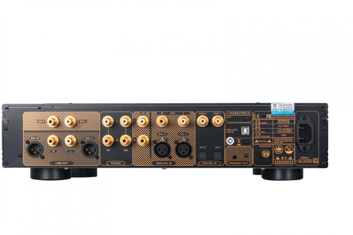 TONE WINNER AD-1PRE Plus - балансный предварительный усилитель. Аналоговые входы — 3 x RCA, 1 x XLR. Цифровые входы — 2 x Toslink, 2 x Coax, USB. Фонокорректор ММ/МС. ЦАП ESS 9028Q2M (PCM до 768 кГц, DSD512). Размеры (ШхВхГ), мм: 444 x 88 x 390 мм. Вес - 9.7 кг