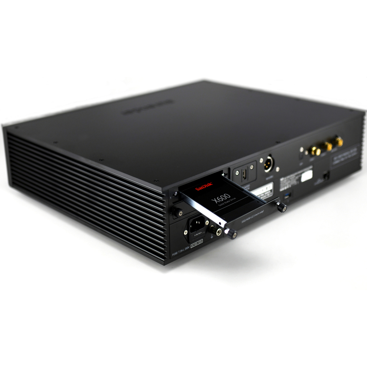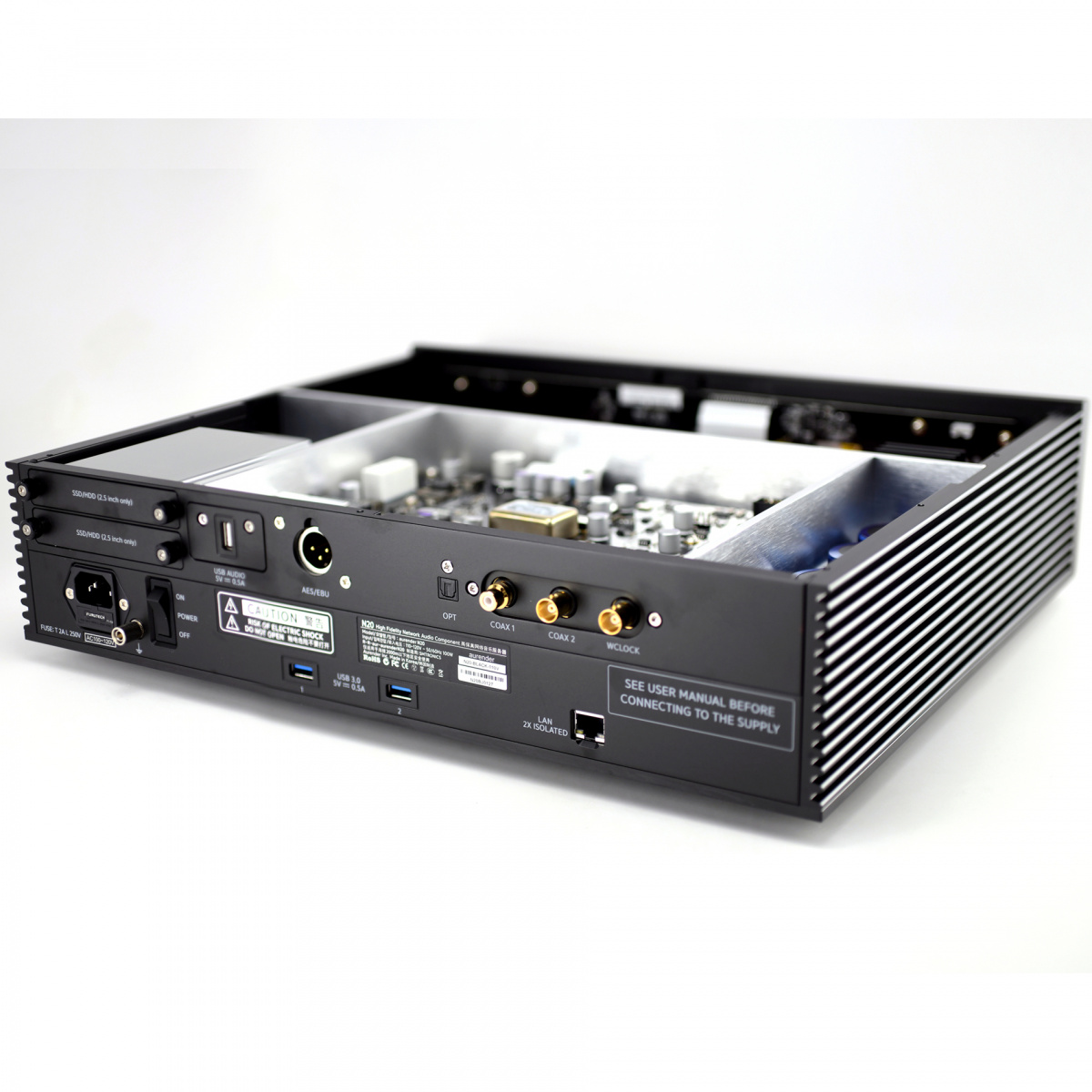 На тыльной панели имеется набор цифровых выходов: S/PDIF-разъемы с трансформаторной развязкой от «земли» (коаксиальные RCA/BNC и оптический), балансный AES/EBU и экранированный USB-выход, поддерживающий PCM до 32 бит/384 кГц, DSD до DSD256 (DoP) и нативный DSD до DSD512. В качестве опции заявлена поддержка MQA. Для внешних накопителей имеются два отдельных USB, а для доступна к локальной сети и NAS-серверам служит LAN-интерфейс с двойной изоляцией от помех. Присутствует вход для внешнего синхронизирующего клока, уменьшающего джиттер и улучшающего звучание при использовании S/PDIF-выходов. Модель собрана в алюминиевом корпусе с 8,8-дюймовым цветным дисплеем.