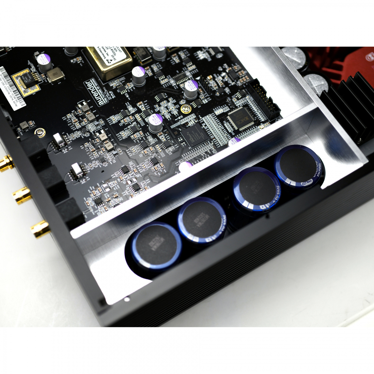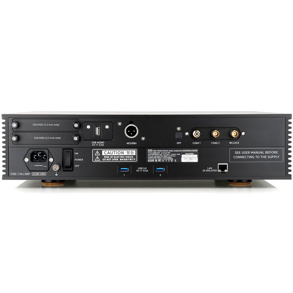 Устройство обладает мощным 4-ядерным процессором Intel, открывающим широкие возможности для декодирования даже таких требовательных к ресурсам форматов, как DSD512 в нативном режиме. Модель оснащается термостатированным кварцевым генератором OCXO, способным сохранять стабильность характеристик даже при изменении температуры внешней среды, а также FPGA-матрицей, позволяющей конвертировать поток DSD в PCM-формат «на лету». При этом доступен выбор выходной частоты дискретизации в диапазоне от 88,2 кГц до 176,4 кГц, коэффициента усиления (от 1 до 6 дБ) и настроек ФНЧ. В Aurender N20 4Tb применяется цифровая схема фазовой автоподстройки частоты ADPLL, которая использует возможности FPGA и OCXO, гарантирует высокую точность синхронизирующих импульсов при передаче цифровых данных и сводит джиттер к ничтожно малому уровню.