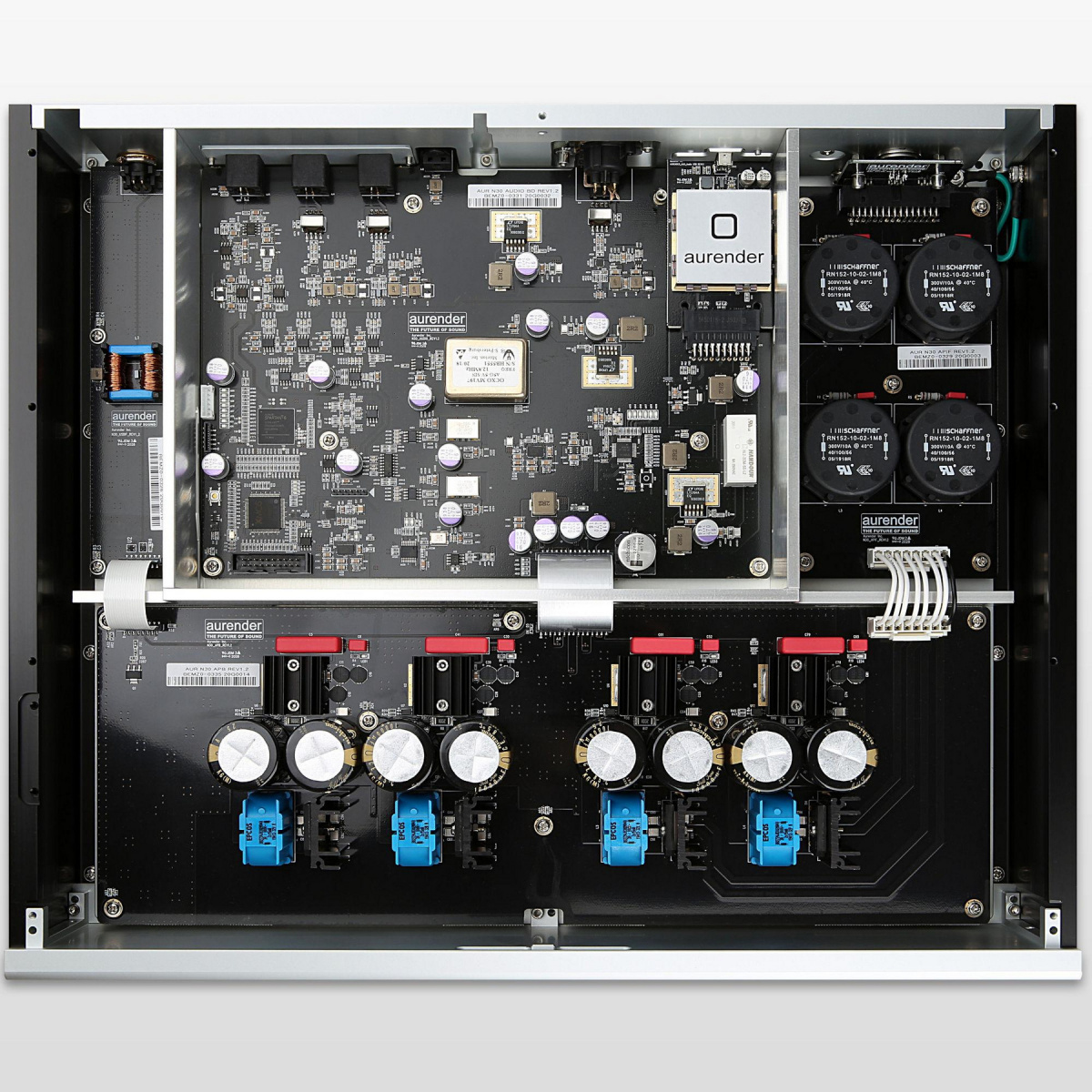 Топовый сетевой стример/сервер Aurender N30SA 8Tb представляет собой образец дальнейшего развития инновационных технологий, примененных в модели N20. Аппарат получил двухблочную конструкцию, состоящую из пары алюминиевых корпусов с верхними антирезонансными экранирующими 10 мм панелями. Блоки соединены с помощью двух кабелей, длина которых позволяет расположить их на некотором расстоянии друг от друга.