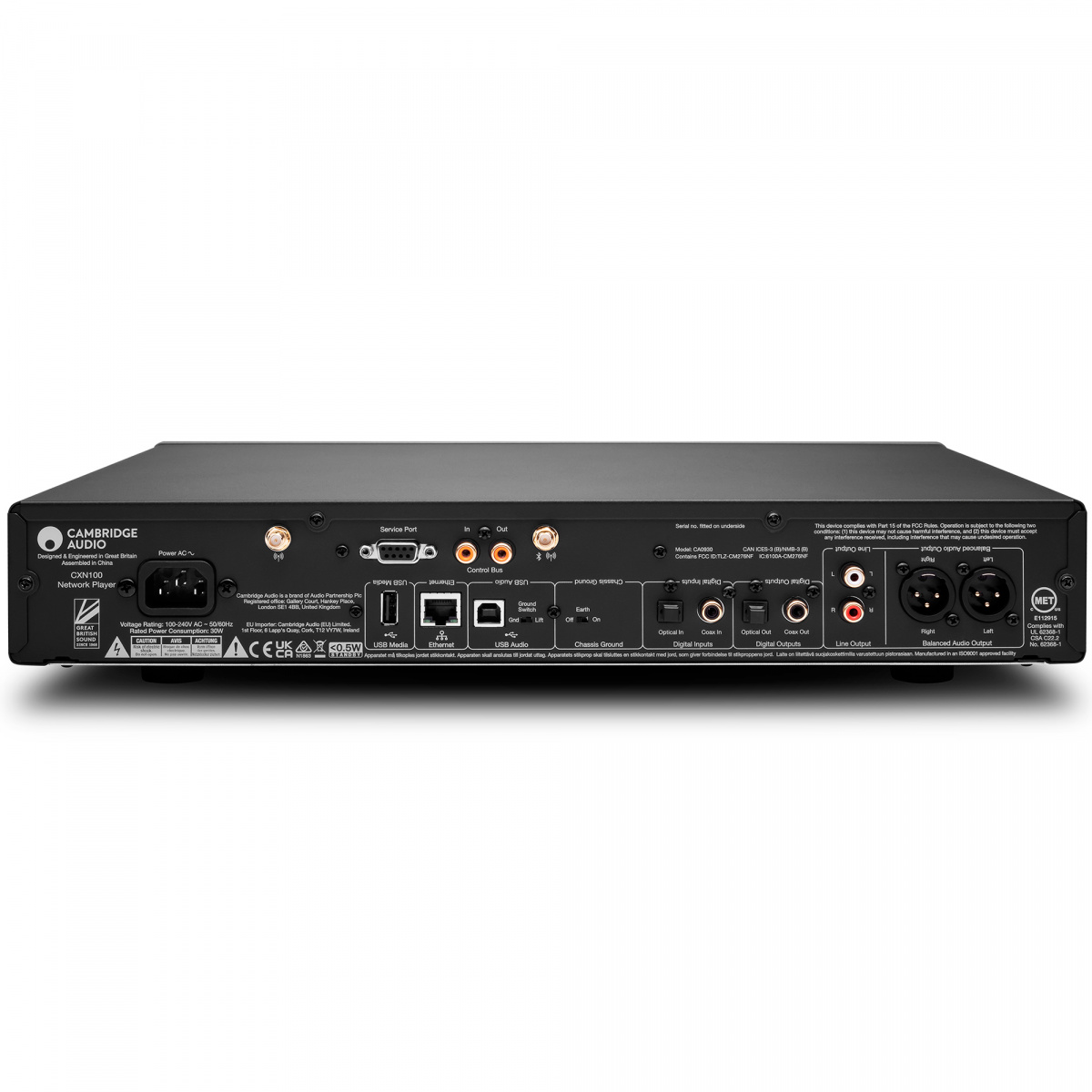 Коммутационные возможности Cambridge Audio CXN100 представлены следующим набором разъемов: входы USB и USB Type B (32 бит/768 кГц, DSD512), коаксиальные (24 бит/192 кГц) и оптические (24 бит/96 кГц), а также RCA и балансные выходы XLR. Также стример поддерживает Bluetooth с кодеками SBC и AAC. Экран передней панели имеет более высокое разрешение и немного больше — 4,8 дюйма (по сравнению с 4,3 дюйма у предшественника). Его по-прежнему легко читать с первого взгляда, благодаря четкому тексту и красочной, яркой обложке альбома. Вокруг экрана стало меньше кнопок, а система меню обновлена, чтобы соответствовать более удобной для пользователя системе Cambridge Evo 75 и Evo 150. Порт USB типа A также был удален спереди.