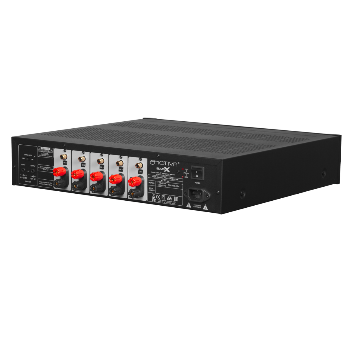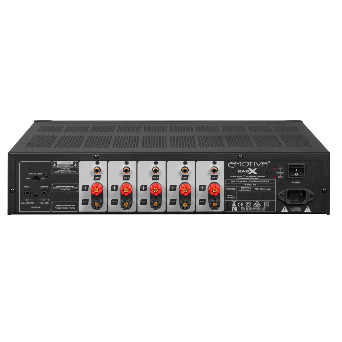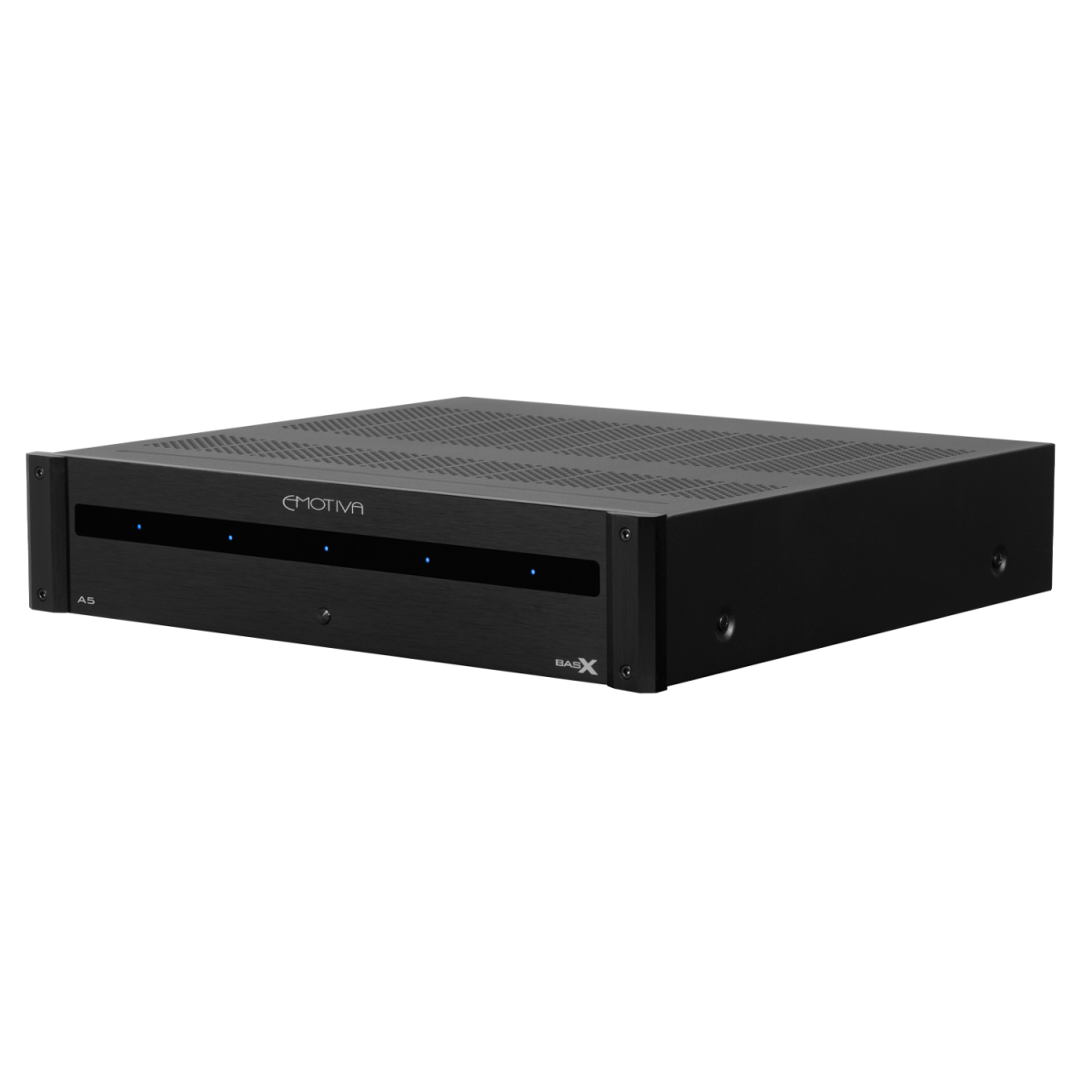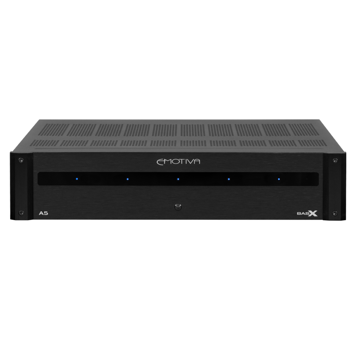 Emotiva A5 предлагает 95 Вт/канал при 8 Ом и 130 Вт/канал при 4 Ом (все каналы задействованы) с номинальным коэффициентом гармонических искажений + шум <0,02% и соотношением сигнал/шум в 116 дБ. BasX A5 оснащен мощным линейным источником питания, защитой от неисправностей, а также триггерными входом и выходом. Высококачественные стандартные несимметричные входы RCA позволяют использовать BasX A5 практически с любым предусилителем или процессором, а пятиполосные винтовые клеммы для акустических систем аудиофильского уровня допускают использование «бананов», плоских контактов или чистого провода. Сочетание этих функций позволяет BasX A5 обеспечивать настоящее качество звука по доступной цене.