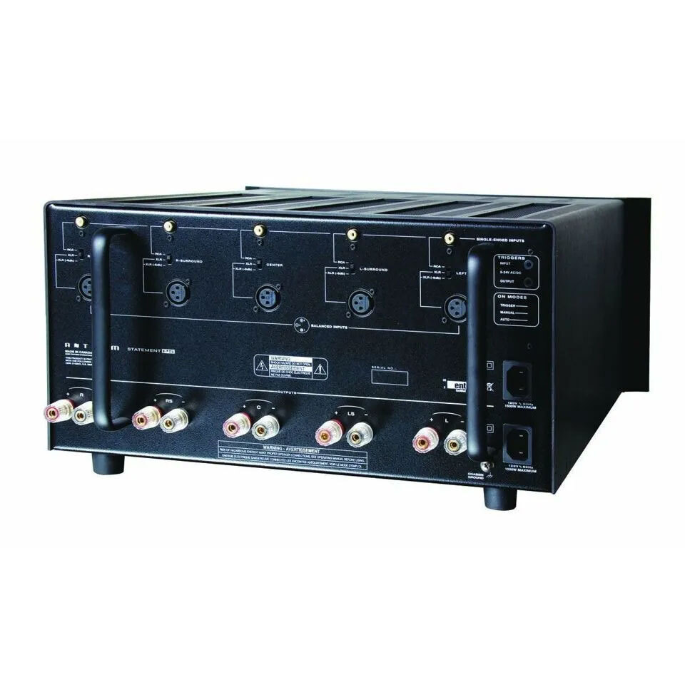 Anthem является брендом известной канадской компании Sonic Frontiers International (SFI), под которым уже почти два десятилетия выпускается высококлассная акустическая аппаратура для видео и аудио систем. Купить технику Anthem по-настоящему престижно, поскольку эта продукция имеет очень высокую репутацию и используется в профессиональных студиях звукозаписи, для трансляции программ радиостанций.Электронные компоненты Anthem позволят вам буквально раствориться в звуке, вне зависимости от того, слушаете ли вы стерео- или многоканальную систему. Бренд Anthem имеет безупречную репутацию производителя аналоговых и цифровых устройств, и электроника Anthem постоянно получает награды в тестах самых уважаемых в аудиомире журналов.При создании техники Anthem главным приоритетом всегда было и остается высокое качество звука при демократичном уровне цен. Пятиканальный усилитель P5 из линейки Anthem Statement можно отнести к элите хай-энда — и по исполнению, и по уровню заложенных в них технологий. Он даже выглядят профессионально — огромные, черные, с изогнутыми накладками по бокам лицевой панели, напоминающими скобы «маунт рэк». Впрочем, несмотря на индустриальный дизайн, этот монстр не лишен изящества, в основном благодаря филигранной обработке алюминиевых поверхностей. Из соображений пожарной безопасности у Anthem Statement P5 два сетевых ввода, и, соответственно, для подключения понадобится два шнура и две розетки. Одна может не выдержать — при работе на полной мощности аппарат потребляет до 3600 ВА. Рекордная масса(60 кг) обусловлена применением пяти силовых трансформаторов, по одному для каждого канала. Выпрямители и фильтры тоже раздельные, что дает лучшее переходное затухание между каналами и более высокие динамические характеристики.Чувствительность каждого из входов (здесь RCA также продублированы балансными XLR) можно снизить на 6 дБ переключателями на задней панели.