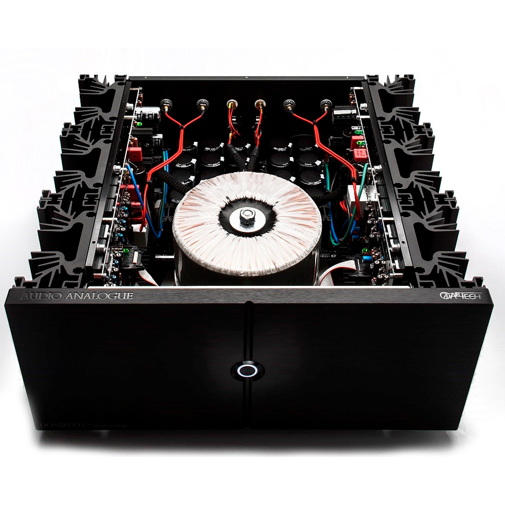 Audio Analogue Donizetti Anniversary – полностью двойной моно. Конфигурация, начиная с двух тороидальных трансформаторов по 1200 ВА каждый, конкретно спроектирован так, чтобы иметь очень низкую потерю потока. Он использует конфигурацию SeGeSTA (одиночный каскад усиления), за которым следует группа из четырех транзисторов, обеспечивающих все необходимый ток, не влияя на производительность этапа усиления. Усилитель не использует глобальную обратная связь. Четырёхслойная печатная плата была разработана таким образом, чтобы входной сигнал никогда не пересекал выходной и стадии усиления находятся так далеко, как это возможно от силовых трансформаторов. Все компоненты высочайшего уровня: военные стандартные резисторы, пластиковые конденсаторы Airtech, проводные соединения из чистой меди 7N OCC, разъемы из чистой меди с медным и позолоченным покрытием.
